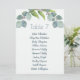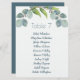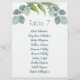 Botanical eucalyptus leaves, wedding table number sheet of paper with list of names. Pale green paper - shown here on the thickest 17.5 weight, in largest size - has bold, blue-green printed font at the top for the table number and a list of names in handwritten script beneath. Combine names if needed, or leave spaces. A curved swag of greenery decorates the top. The nature theme will work for many wedding types including rustic and outdoor. Hang on a background of some kind to match your wedding theme for an easy way to help guests find their tables. Reverse is blank in solid dark blue-grey. If larger paper is needed, transfer this design to a poster or 8x11 inch paper.