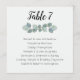 Botanical eucalyptus wedding table number square paper with list of names. Bold script at the top for the table number, with a sprig of grey-blue eucalyptus leaves. The a list of guests’ names are printed beneath. Double up on names as needed, such as “Mr. & Mrs.” or couples listed together. The nature theme will work for many wedding types including rustic and outdoor. Paper shown is rustic kraft, with more types to choose from. The back of the paper has a leafy bunch of stems hanging from the top. Hang on a background of some kind to match your wedding theme for an easy way to help guests find their tables.