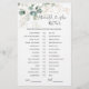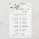Would She Rather Bridal Shower Game. This design features an illustration of eucalyptus foliage and gold leaves in watercolor style. On the top of the card - gold effect confetti. The text "Would she Rather" is written in script font.