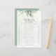 This charming "Would She Rather" game features a delicate design of eucalyptus greenery and soft gold accents, creating a chic and elegant atmosphere for your bridal shower. The game includes a series of playful and thought-provoking questions that will spark laughter and conversation among your guests as they try to predict the bride's preferences. With its beautiful design and interactive format, this fun party activity card is sure to be a memorable addition to your bridal shower celebration.