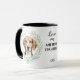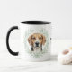 "LOVE MY AMERICAN FOXHOUND" declares this mug for the Foxhound dog owner. Each side of the mug has a beautiful portrait of a tricolor Foxhound framed by soft green watercolor eucalyptus leaves. Between the two images is the text, which may be easily customised, or even removed by you, and your monogram or name.