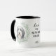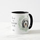 "LOVE MY BEARDED COLLIE" declares this mug for the proud Beardie dog owner. Each side of the mug has a beautiful portrait of a Bearded Collie framed by soft green watercolor eucalyptus leaves. Between the two images is the text, which may be easily customized, or even removed by you, and your monogram or name.