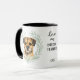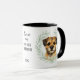 "LOVE MY BORDER TERRIER" declares this mug for the Border Terrier dog owner. Each side of the mug has an adorable portrait of a little Terrier framed by soft green watercolor eucalyptus leaves. Between the two images is the text, which may be easily customized, or even removed by you, and your monogram or name.
