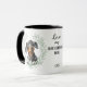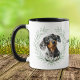 "LOVE MY DACHSHUND DOG" declares this mug for the proud Doxie dog owner. Each side of the mug has an adorable portrait of a black and tan Dachshund Hound Dog framed by soft green watercolor eucalyptus leaves. Between the two images is the text, which may be easily customized, or even removed by you, and your monogram or name.
