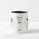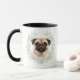"LOVE MY PUG" declares this mug for the Pug dog owner. Each side of the mug has a portrait of an adorable fawn colored Pug framed by soft green watercolor eucalyptus leaves. Between the two images is the text, which may be easily customized, or even removed by you, and your monogram or name.