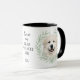 "LOVE MY GREAT PYRENEES DOG" declares this mug for the Great Pyrenees owner. Each side of the mug has a portrait of a beautiful white Great Pyrenees dog framed by soft green watercolor eucalyptus leaves. Between the two images is the text, which may be easily customized, or even removed by you, and your monogram or name.