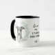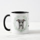 "LOVE MY ITALIAN GREYHOUND" declares this mug for the Italian Greyhound dog owner. Each side of the mug has a portrait of a gray and white Italian Greyhound framed by soft green watercolor eucalyptus leaves. Between the two images is the text, which may be easily customized, or even removed by you, and your monogram or name.