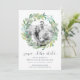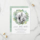 Our Eucalyptus Wreath save the date card frames your favourite engagement photo with a round wreath of painted eucalyptus branches and green leaves in shades of sage and spring green. A modern and elegant choice for spring or summer weddings accented with chic calligraphy lettering. Personalise with your names, wedding date, location and wedding website using the fields provided.