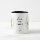 "LOVE MY POODLE" declares this mug for the Poodle dog owner. Each side of the mug has a portrait of an adorable little Poodle dog framed by soft green watercolor eucalyptus leaves. Between the two images is the text, which may be easily customized, or even removed by you, and your monogram or name.
