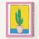 This useful notebook is decorated with quirky art of a green, prickly Euphorbia Cactus in a pot, and can be personalised with your name and words. Behind the cactus is yellow and blue, the pot is pinky beige, all inside a thin black border, with a white surround. The background colour of the notebook is dusky pink. It's a charming example of simple, fun, naive, art. The drawing is also on the back of the notebook.