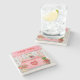 The coasters are gorgeous, a quality feel and heavy weight. They look like a precious archeological find. A rustic stone juxtaposed with a modern floral black and white print. I like the way the print goes slightly imperfect on the cut stone edges giving them a kind-of natural beauty.
