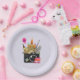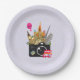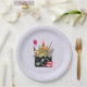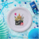 Paper plates with a graphic illustration featuring European landmarks such as leaning tower of Pisa, Big Ben, Eiffel Tower etc... A hot air balloon in the sky and a double decker bus, with a large camera. A stamp with the Egyptian pyramids stuck to the camera.