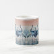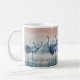 Beautiful cranes wading in the water of the lake. The rising sun illuminates the silhouettes emerging from the mist. Illustration painted with watercolors.