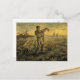 Evening: The End of the Day (after Millet) by Vincent van Gogh is a vintage fine art post impressionism daily life portrait painting featuring a peasant farmer at the end of a long day of work in the fields farming potatoes. He is putting his jacket back on and getting ready to head home at sunset.