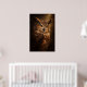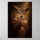 A watchful owl emerges from deep shadow in this dramatic wildlife portrait. Warm light reveals rich feather textures and piercing golden eyes, capturing the quiet intensity of a nocturnal hunter.