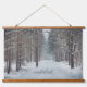 Nature-themed Hanging Tapestry in soft grey and blue tones: forest power line at the snowy magical evening and a path through a winter forest. Perfect choice for minimalist, rustic or Scandinavian styl interior.