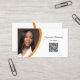 A orange border sets off the photo on this business card design featuring a photo placeholder on the left with template name, title and QR code on the right. The back includes a colour coordinated design with text fields for the business name and details. Replace the placeholder photo with your vertical format photograph and your QR code on the front. Fill in the template fields, remove text or click customise to select a font style, size, and colour you like. Use your QR code to send customers to a website, reviews page, photos or other special page. The placeholder photo is courtesy pixabay.com.