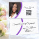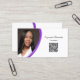 A purple border sets off the photo on this business card design featuring a photo placeholder on the left with template name, title and QR code on the right. The back includes a colour coordinated design with text fields for the business name and details. Replace the placeholder photo with your vertical format photograph and your link for the QR code on the front. Fill in the template fields, remove text or click customise to select a font style, size, and colour you like. Use your QR code to send customers to a website, reviews page, photos or other special page. The placeholder photo is courtesy pixabay.com.