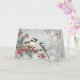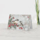 Chickadees perched on an evergreen branch amidst red berries and snowflakes, with a soft grey textured background giving a nostalgic, vintage touch.