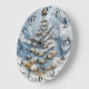 A beautifully crafted clock featuring an intricately designed Christmas tree. The clock displays a winter wonderland vibe with a blend of blue and white hues, evoking the spirit of the holiday season.
