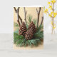 On this card, you'll see a beautiful picture 🌟 It shows three pine cones in the center, with lots of details on their brown scales 🌲 The pine cones are surrounded by fresh and green pine needles, making a nice contrast. Everything looks balanced and calm, with a soft light shining on them 🌞 In the background, there's a cozy beige color and blurry branches 🌿 This picture reminds you of the peaceful and lovely forest 🌲🌳 It's perfect for spreading holiday cheer and warm wishes to your friends and family 🎄🎁✨