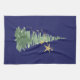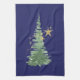 A watercolor painting of an evergreen tree, with gold stars trailing around it, against a dark blue background creates a contemporary holiday kitchen towel with traditional images. Beautiful and modern.