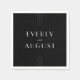 This sleek black wedding napkin from the Everly Collection features crisp white type, geometric art deco accents, and editorial spacing. The simple thin triple-line motifs frame elegant text for a refined, modern minimalist, evening-ready look.