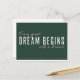 Simple, stylish “Every great dream begins with a dreamer” postcard with modern typography in pale peachy pink and white with a rich forest green background in a minimalist design style based on the quote by Harriet Tubman.