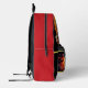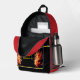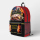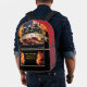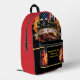 This custom First Responders Firefighters Backpack features Four firefighters in full gear stand in front of an American flag with flames surrounding them, holding a hose towards a burning car. symbolising bravery and heroism,
