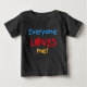 A cute, fun, colourful text design on T-shirts, bodysuits, raglan T-shirts, hats, sleeveless dresses, ruffle shirts and dresses, organic bodysuits, sweatshirts, pullover hoodies, dark T-shirts, and other apparel that reads Everyone Loves Me with text of blue, red, and gold.