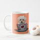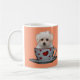 Everything appears better with a cuppa! Cute Maltese Puppy sitting in a cup and saucer. The cup is white and red, with red hearts on the cup. On the other side of the mug, the Maltese pup is sitting without the cup, there is curved customisable text underneath which says "Everything appears better with a cuppa!". Both images can be changed, as can the curved text to customise this product making a perfect gift.