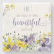 Stone coaster with lovely yellow and purple flowers and scripture verse from Ecclesiastes 3:11, "He has made everything beautiful in its time." Designed by Simply Scripture; elements from The Hungry Jpeg.