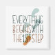 Hand lettering of a motivational text saying Everything Begins With The First Step and with footprints across the text, where the first footprint is accented with stronger colour.