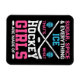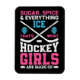 Hockey theme flexible magnet for the hockey girl with hockey pucks, sticks and helmets with pink, white, and blue text that reads Sugar, Spice and Everything Ice That's What Hockey Girls Are Made Of!