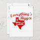 This postcard contains a red graphic and text in the shape of the state of Texas.