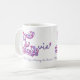 Decorated hand drawn letter with your own name beginning with E and name meaning mug. Pretty heart and flower capital E doodled typographic design featuring hearts and flowers and the words Evie Blessed in life. Happy and loving a true treasure. in pink and purple. © Unique art and design by Sarah Trett. www.sarahtrett.com for www.mylittleeden.com on zazzle