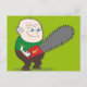 This is a cartoon illustration of an older bold man who's looking kinda angry at his chainsaw. Let's hope he's only planning on cutting down a tree and nothing more evil!