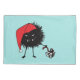 Funny evil Christmas pillowcase with a black cartoon grinning bug unpacking a Christmas present.