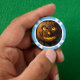 Sinister smile: A menacing jack-o'-lantern stares out from a spooky graveyard scene, its fiery glow piercing the darkness of a full-moon Halloween night.