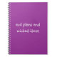 Custom notebook/journal with 'evil plans and wicked ideas' in purple and white.