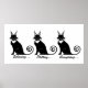 3 black and white illustrated silhouette style cats sit waiting, plotting their next mischievous master plan.