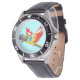 My husband loves the watch, he likes the dial, the graphics, the band, and it keeps perfect time.