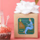 This personalised bookplate has a vintage stencil look. A woman in a blue dress sits at a writing desk with pen raised while a lamp shines next to her. The background is dark teal. The woman looks like she is from the 19th or early 20th century. The design has a modern Art Deco feel with squared lettering. The desk says, "Ex Libris," meaning "from the books / from the library of" in Latin.