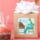 This personalised bookplate has a vintage stencil look. A woman in a turquoise blue dress sits at a writing desk with pen raised while a lamp shines next to her. The background is light mint green-blue. The woman looks like she is from the 19th or early 20th century, with dark skin and brown hair. The design has a modern Art Deco feel with squared lettering. The desk says, "Ex Libris," meaning "from the books / from the library of" in Latin.