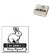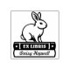 An Ex Libris rubber stamp with a little rabbit sitting on and guarding two books. Ex Libris text on the top most book with customisable name text on the lower book in stylish script.