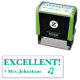 This inspirational rubber stamp design features the motivational message "EXCELLENT!" and a custom teacher's name. It also features a decorative beamed eighth notes. It could be used by a teacher, educator, or tutor when marking assignments, to acknowledge that the student has done a great job.