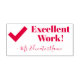 This motivating rubber stamp design features the inspiring feedback message "Excellent Work!" and a personalised tutor's name. It also features a decorative check mark icon. It could be used by a school teacher, educator, instructor, or tutor when grading student work, to acknowledge that a student has done an exceptional job.