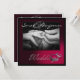 An exchange of rings in black and white photography with dark red background. Highlighted in one corner are stunning platinum wedding bands with the word "Wedding" as embedded caligraphy script text wrapped around the bands