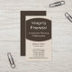 Professional Executive Curves business card design in espresso. This sleek and clean profile card is a great choice for someone interested in making a great first impression. A perfect choice for professionals in the financial sector such as investment planners, anaylsts, loan officers or insurance agents. To make this design your own, add your personal/business information into the fields provided. Fonts and text colours may be changed by clicking on the "Customise It!" button.