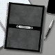 The perfect writing companion for the professional executive—a premium notebook designed for sophisticated style and focused notetaking. This notebook features a sleek Charcoal Gray designer texture and bold black framing, projecting a serious, authoritative aesthetic ideal for the office. The design is dominated by the striking, custom metallic-look name badge (a printed graphic element), instantly conveying high status and personal branding. Use this journal for brainstorming, meeting notes, project tracking, or daily journaling. Its minimalist design promotes an uncluttered focus, making it a superb desk accessory. The name on the badge is fully editable. Easily personalize the notebook with a full name, initials, or professional title. NOTE ON DESIGN: The beautiful textured look and metallic badge are printed design elements applied to the durable notebook cover.